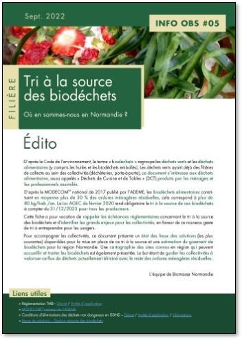 Cette fiche a pour vocation de rappeler les échéances réglementaires concernant le tri à la source des biodéchets et d’identifier les grands enjeux pour les collectivités, en faveur de ce nouveau geste de tri à entreprendre pour les usagers. Pour accompagner les collectivités, ce document présente un état des lieux des solutions (les plus courantes) disponibles pour la mise en place de ce tri à la source et une estimation du gisement de biodéchets pour la région Normandie. Une cartographie des sites connus en région qui peuvent accueillir et traiter les biodéchets est également présentée. Le but étant de guider les collectivités à valoriser ce flux de déchets actuellement éliminé avec le reste des ordures ménagères résiduelles.